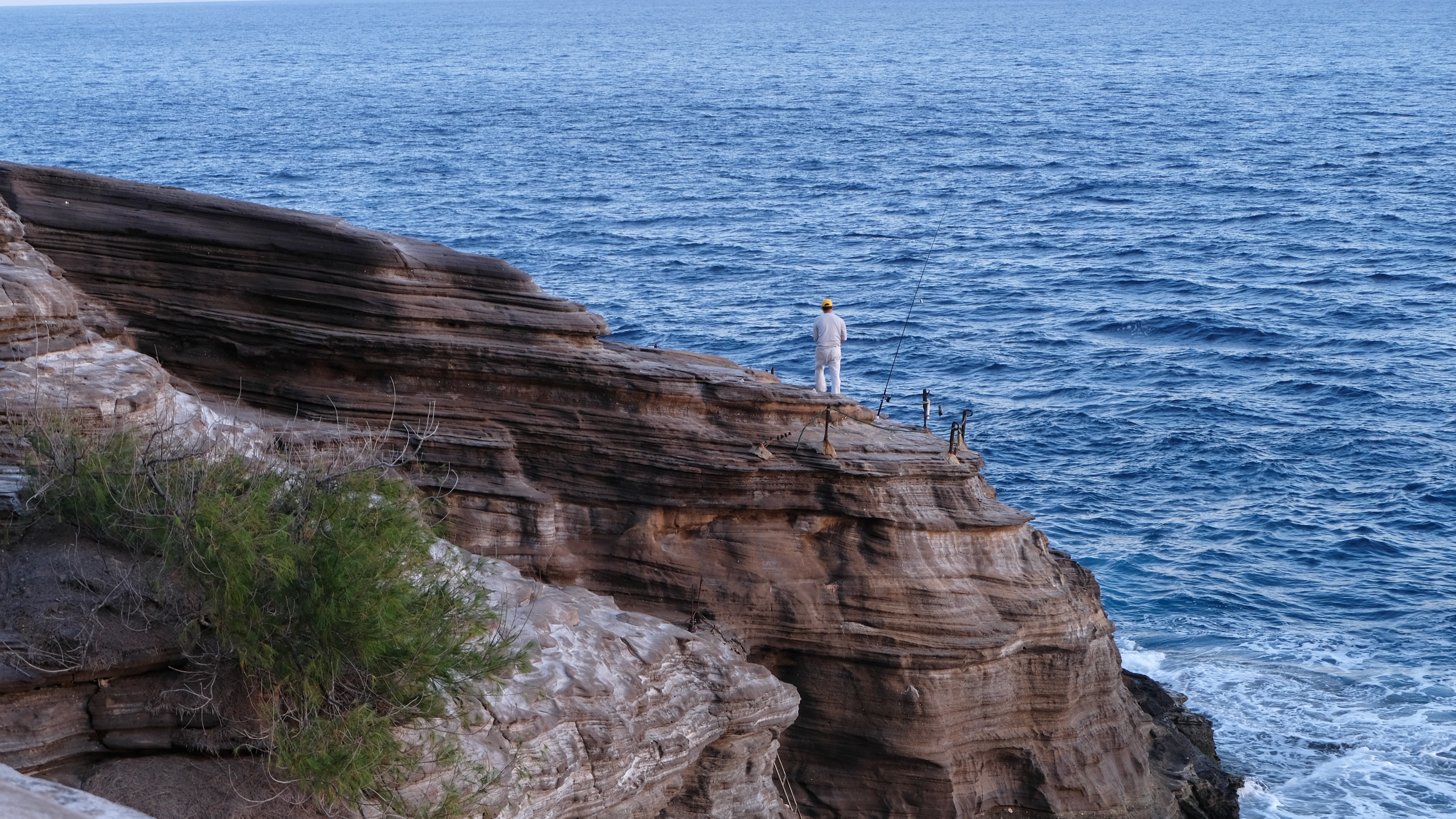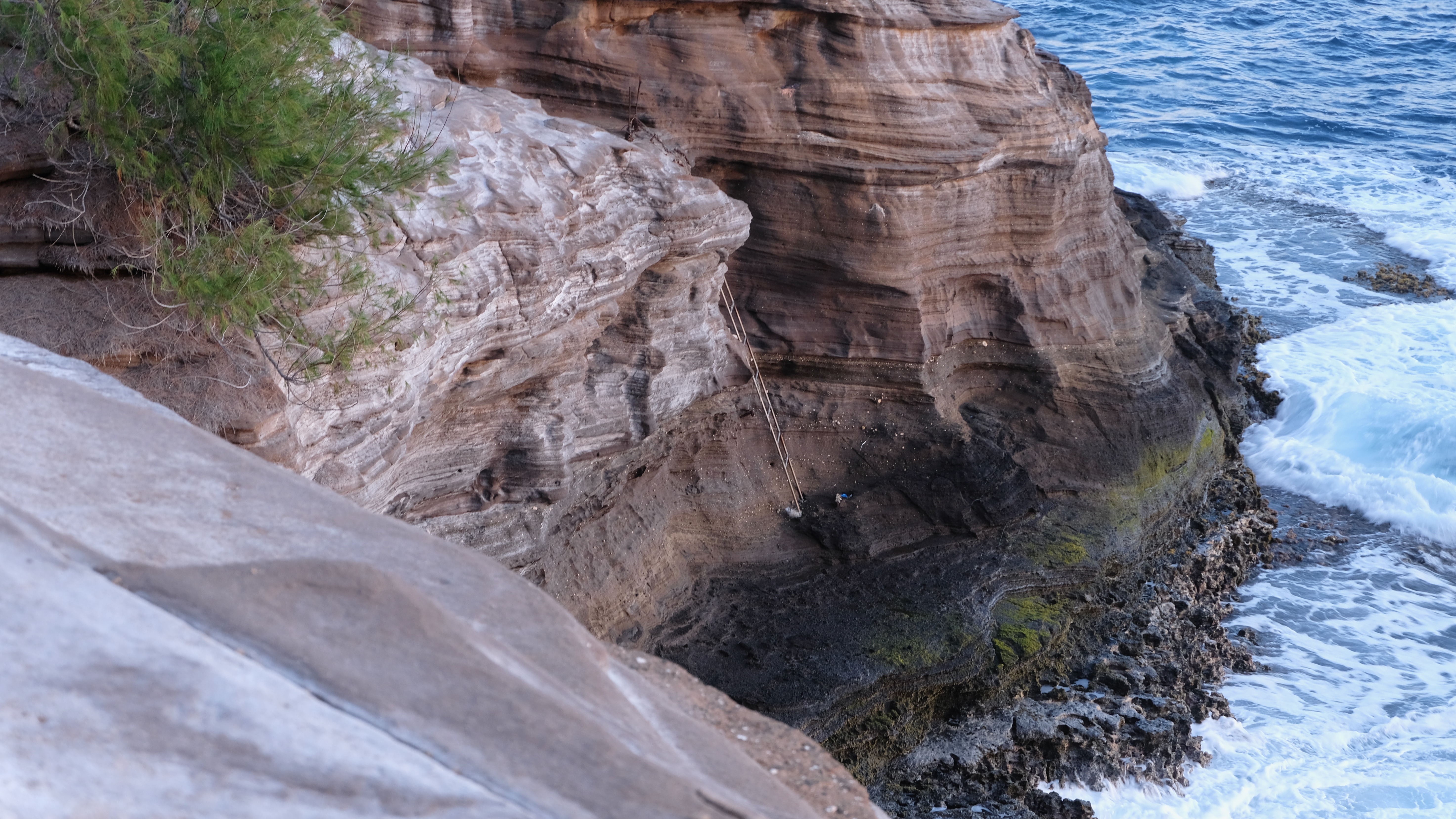 I was more incited by the rocks and the water hitting and swirling around the rock face. So many red layers that contrasted with the blues. I didn’t notice until looking at the photos there’s a rope ladder and a rope to get down to the rocks. Or for after Google images, climbing back up after cliff diving. I didn’t know at the time it was Spitting Cave. Now it clicks the beautiful swirling sea ocean patterns. I can never get used to call it the ocean. I’m used to sea.