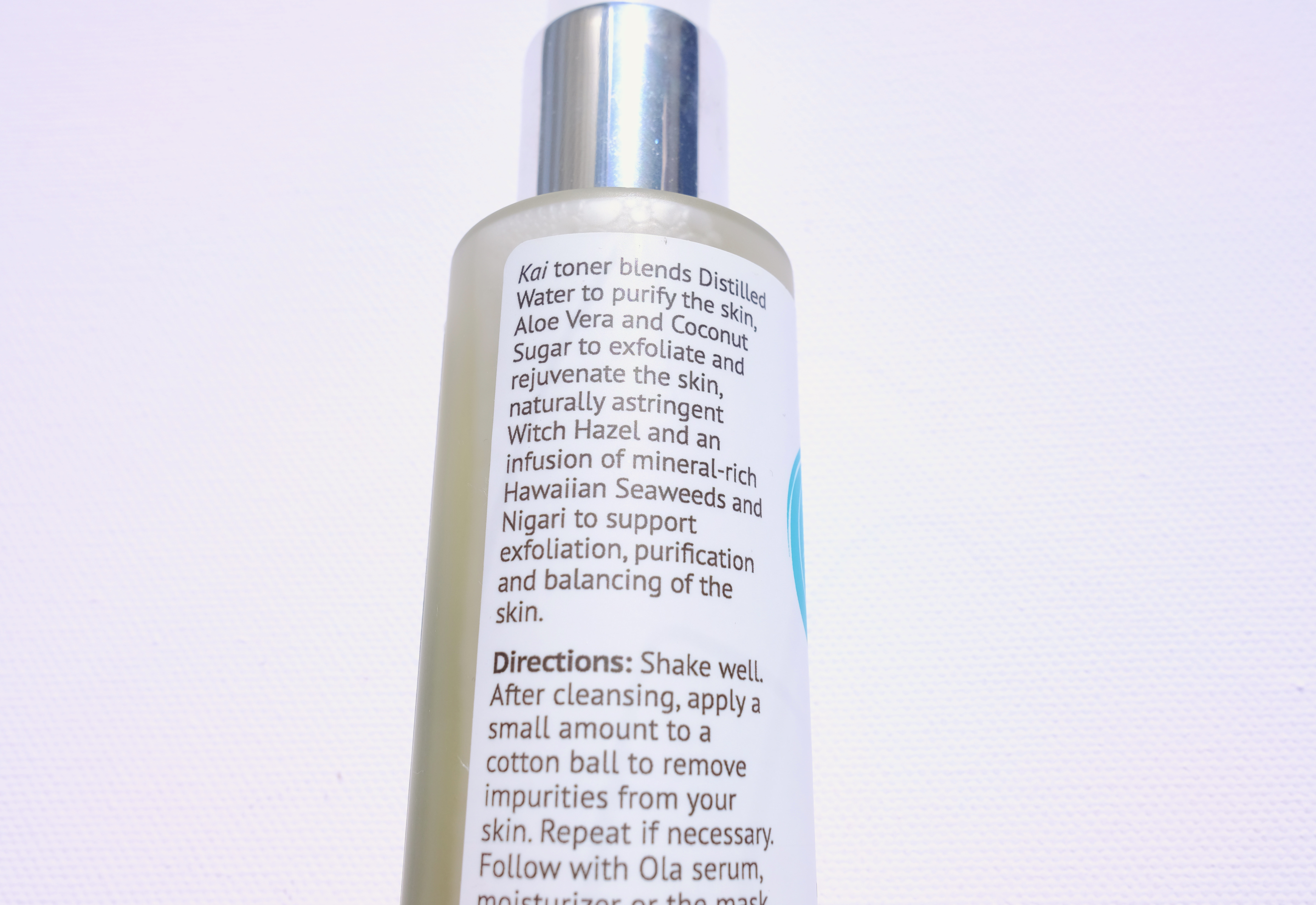 Kai toner blends Distilled Water to purify the skin, Aloe Vera and Coconut Sugar to exfoliate the skin, naturally astringent Witch Hazel and an infusion of mineral-rich Hawaiian Seaweeds and Nigari to support exfoliation, purification and balancing of the skin.