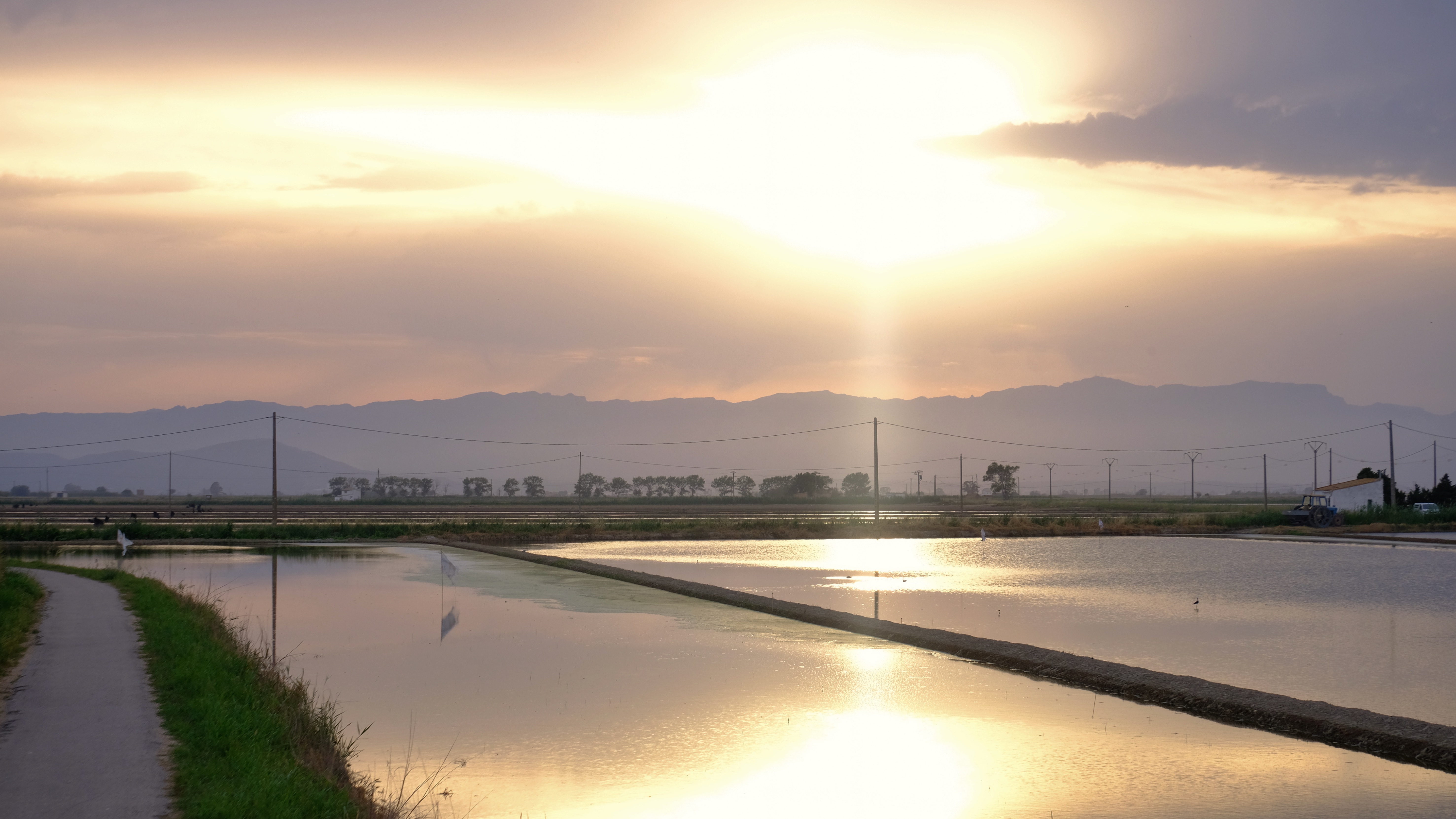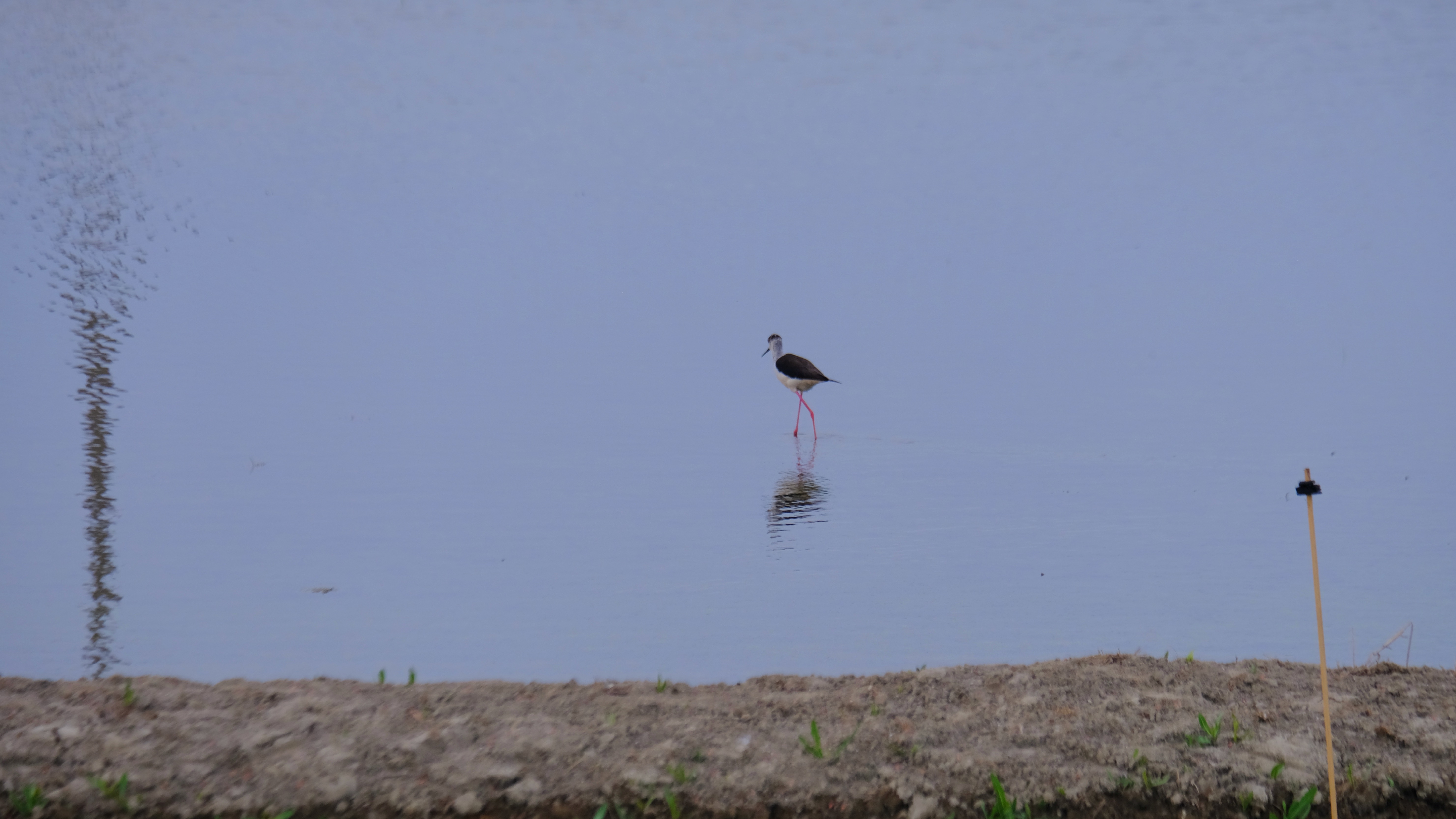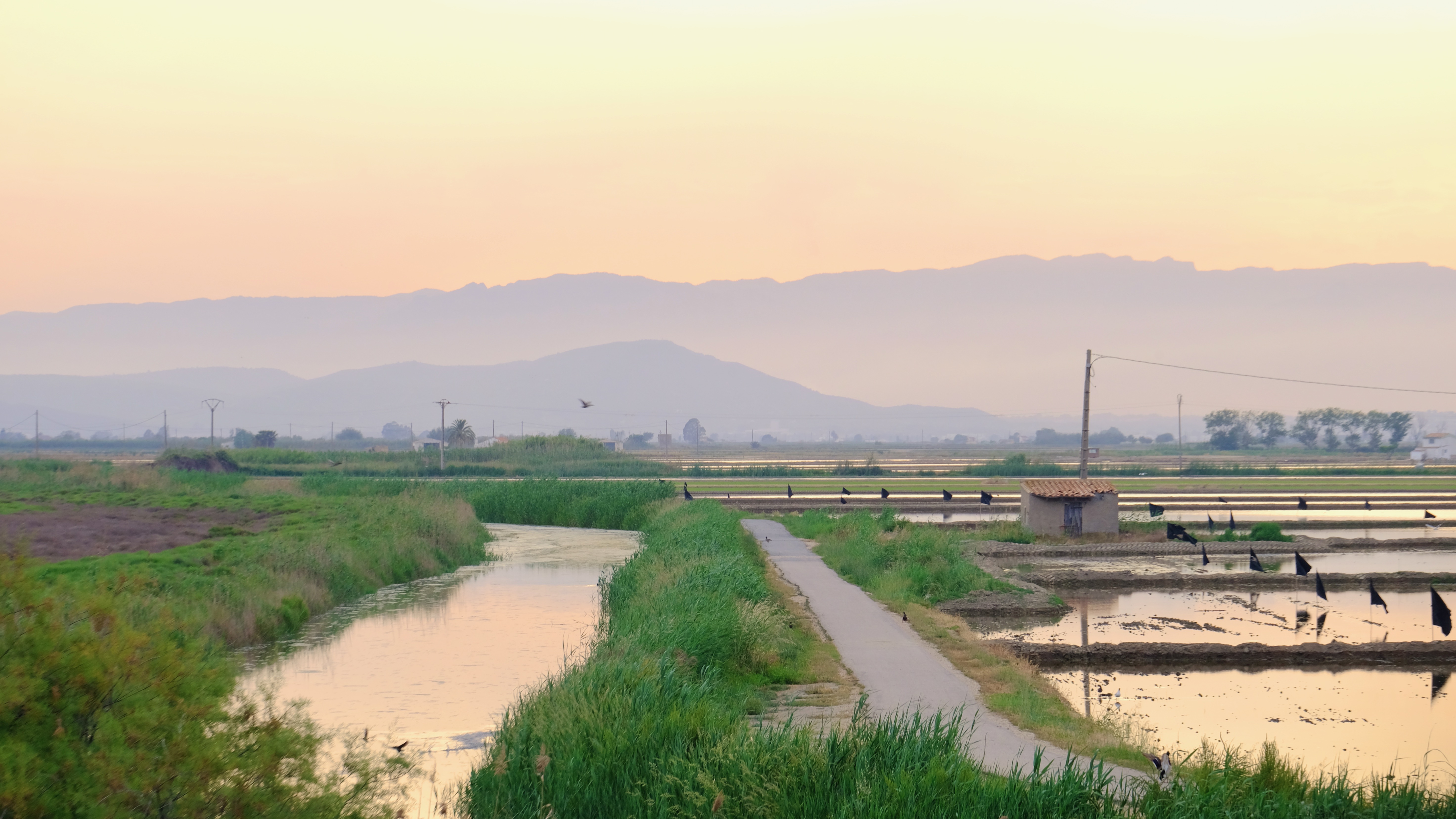 View from the hide looking towards the mountains. Some farmers use black plastic flags to scare away birds from the rice, others use timed sound guns which echo across the whole delta.