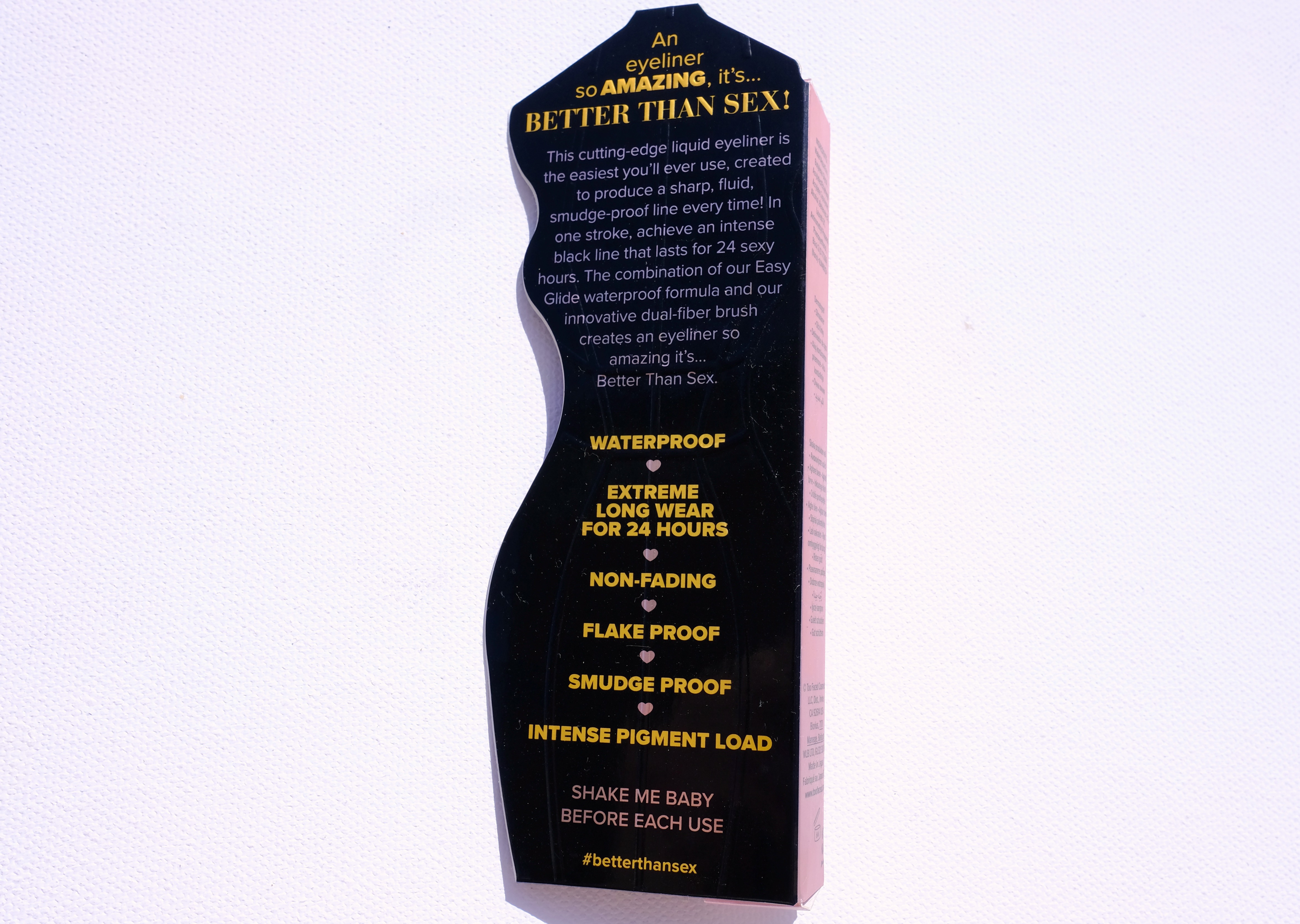 An eyeliner so amazing, it’s… better than sex! This cutting-edge liquid eyeliner is the easiest you’ll ever use, created to produce a sharp, fluid, smudge-proof line every time! In one stroke, achieve an intense black line that lasts for 24 sexy hours. The combination of our Easy Glide waterproof formula and our innovative dual-fiber brush creates an eyeliner so amazing, it’s… Better Than Sex.