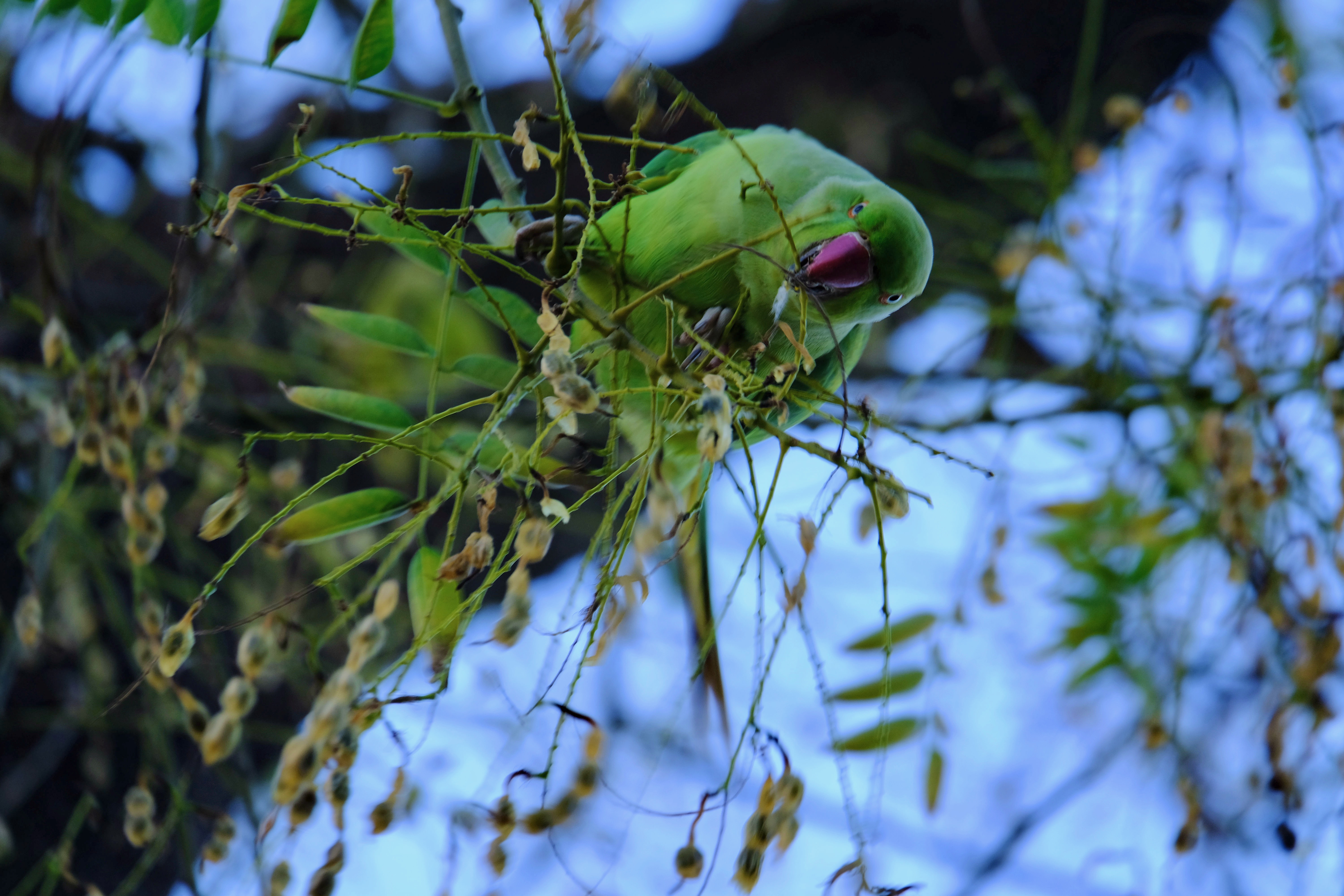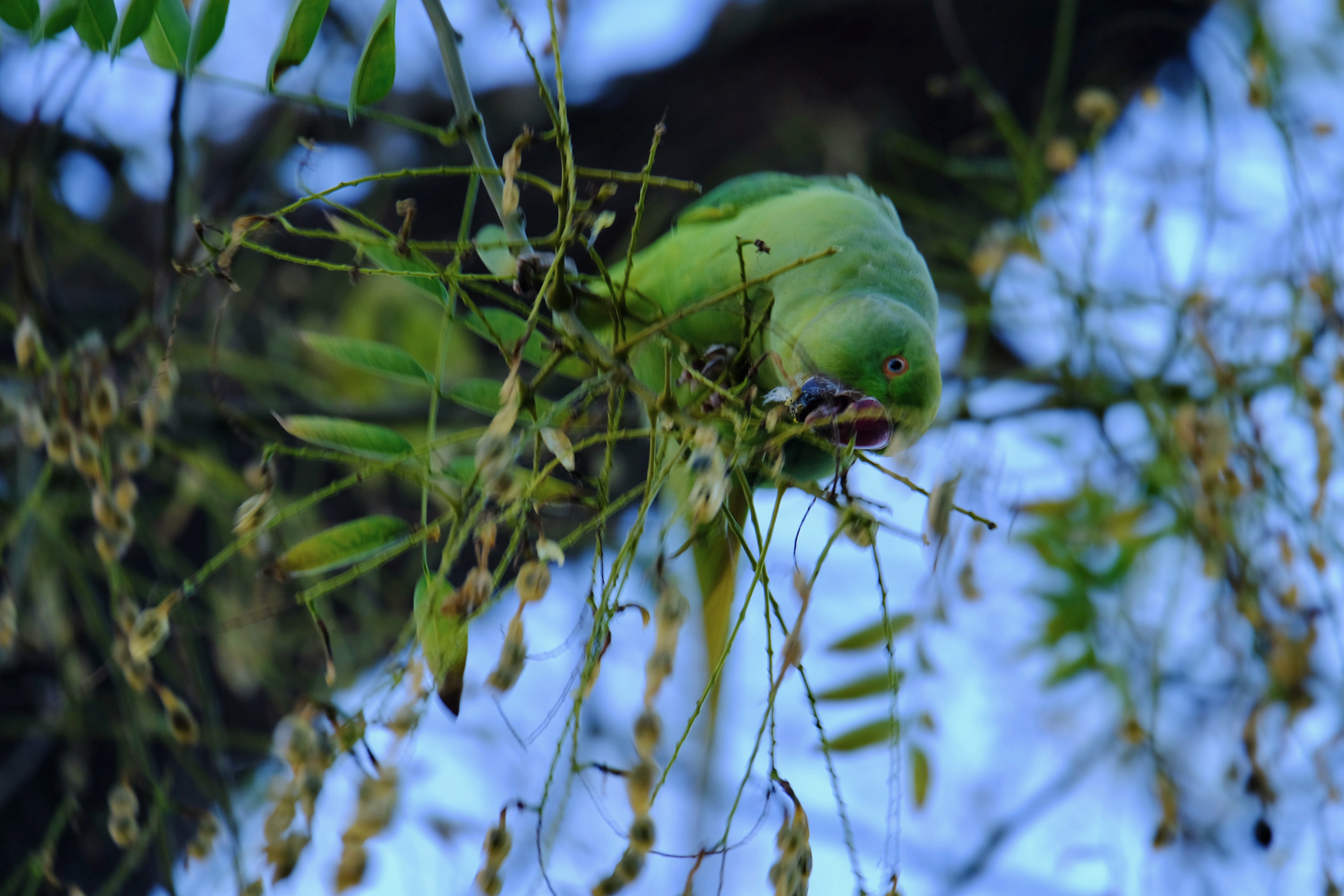 Nearly caught up! Promise! A monk parakeet as well as some starlings and sparrows snacked on the whatever this tree is, at Zoo Barcelona dropping bits as they lazily ate.